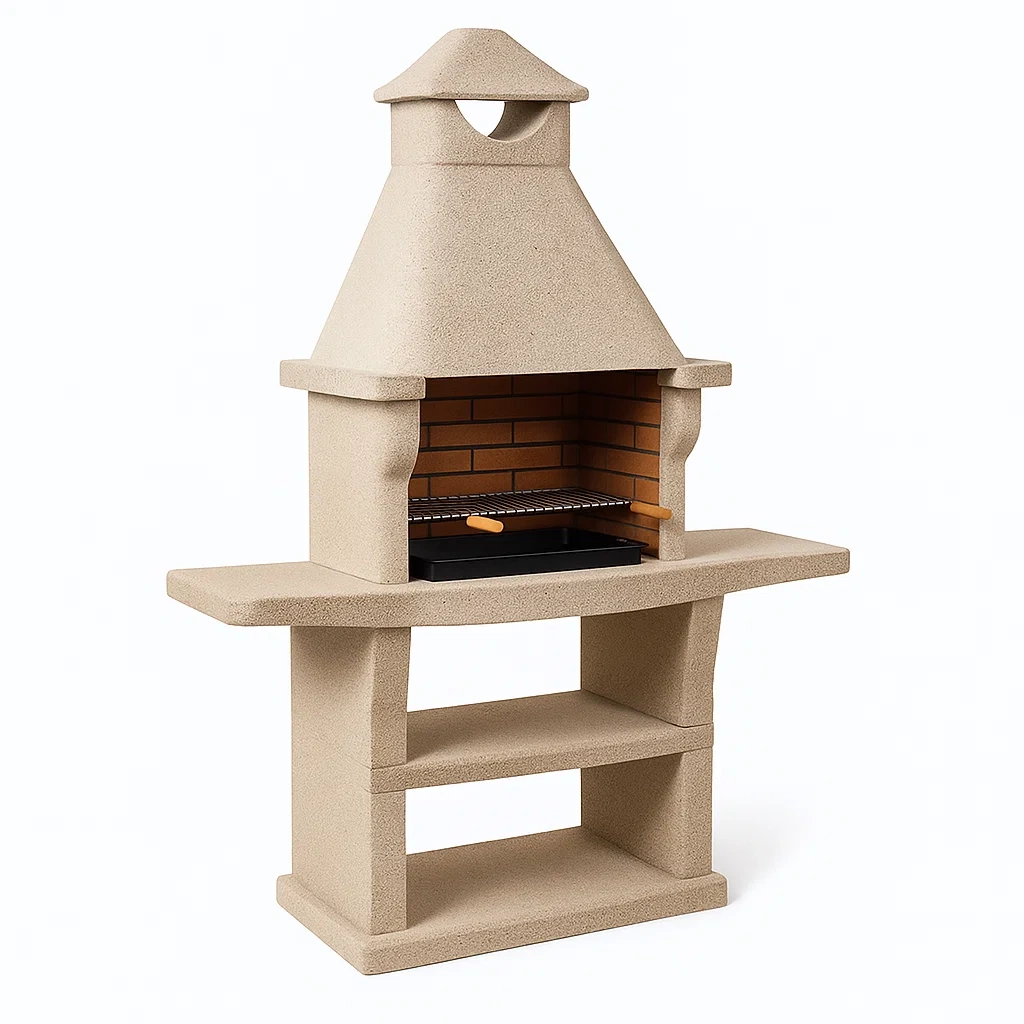 Le barbecue est fabriqué en pierre béton pour la structure principale et utilise des briques réfractaires à l'intérieur. La grille est en acier inoxydable avec des poignées en bois.