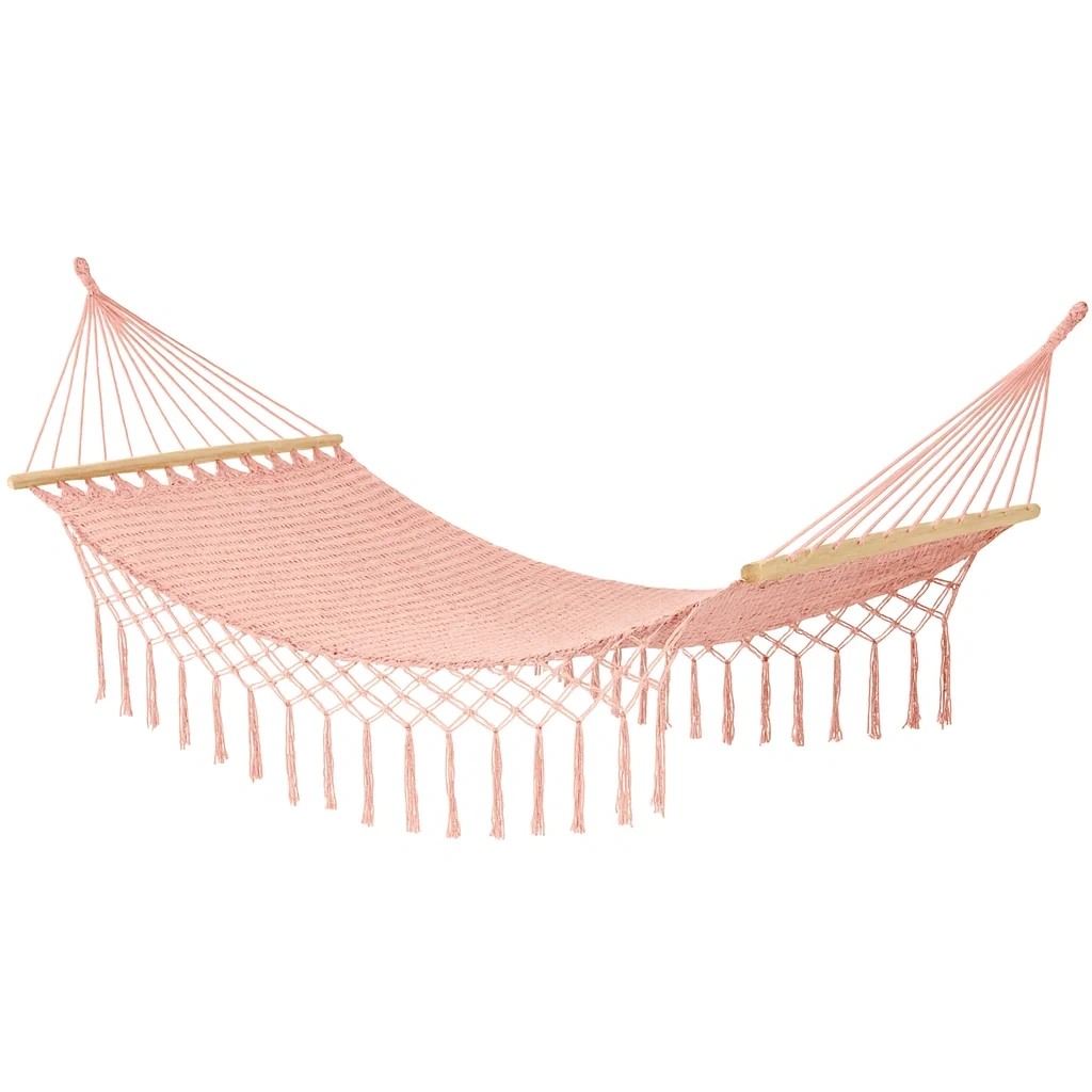 Ce hamac est fabriqué en coton de qualité avec des barres en bois pour assurer stabilité et confort.