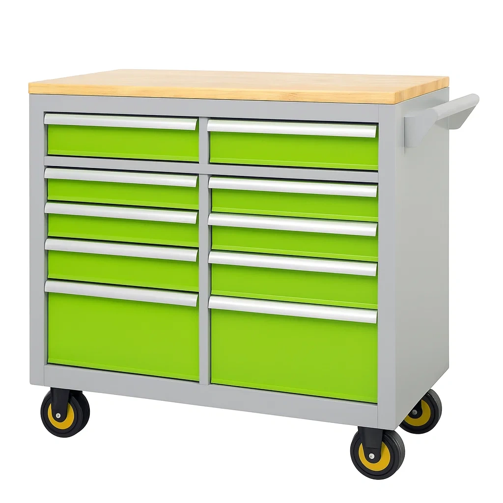 Comprend 10 tiroirs de tailles variées et des roues pivotantes en caoutchouc avec système de verrouillage.