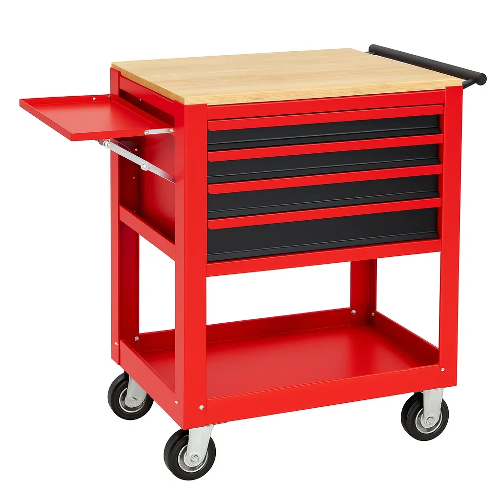 Il comprend quatre tiroirs spacieux pour le rangement des outils ainsi qu'une tablette latérale rétractable.